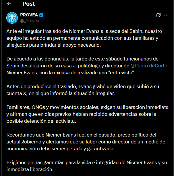 Provea indicó que familiares, organizaciones no gubernamentales y movimientos sociales exigen la liberación inmediata de Nicmer Evans, al tiempo que denunciaron que en días anteriores habían recibido advertencias sobre una posible detención del activista y comunicador.