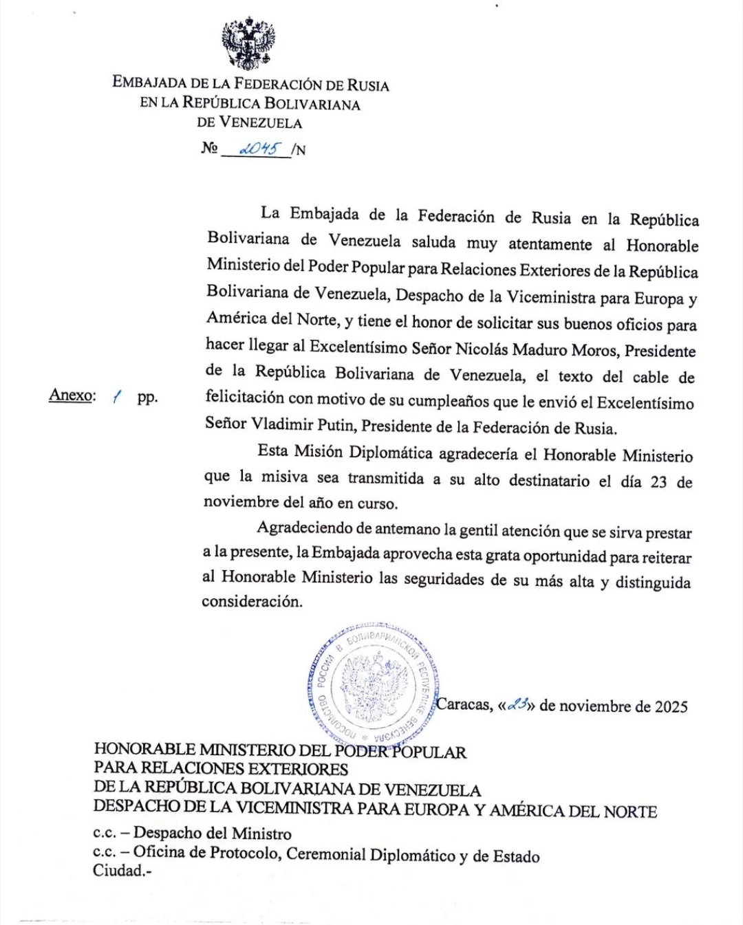 El presidente ruso, Vladimir Putin, ratificó su compromiso con el chavismo en su relación estratégica, según una carta enviada por la Embajada de Rusia en Caracas y compartida este sábado por el diplomático Yván Gil.