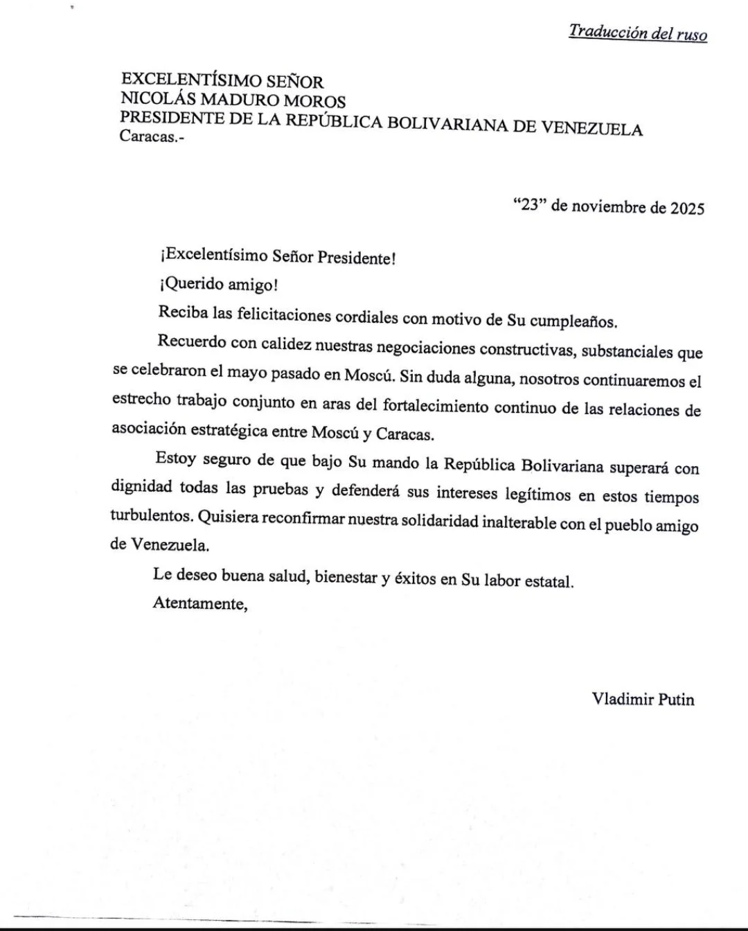 «Sin duda alguna, nosotros continuaremos el estrecho trabajo conjunto en aras del fortalecimiento continuo de las relaciones de asociación estratégica entre Moscú y Caracas», manifestó Putin en la carta, enviada a Nicolás Maduro en la víspera de su cumpleaños.