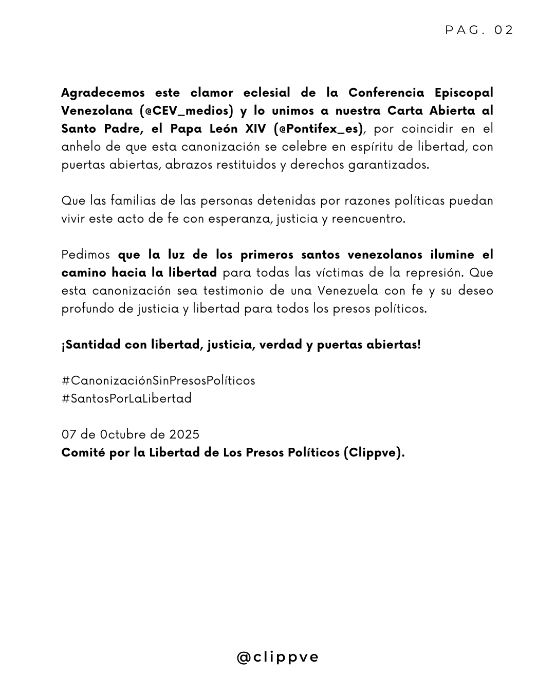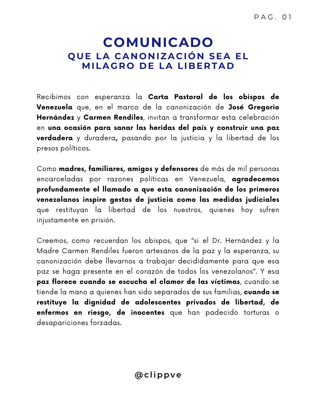El Comité de los Presos Políticos (Clippve) emitió este miércoles 8 de octubre un comunicado en el que celebran la Carta Pastoral de la Conferencia Episcopal Venezolana (CEV) y piden que la canonización de José Gregorio Hernández y la madre Carmen Rendiles sea un símbolo de reconciliación, justicia y libertad en el país.