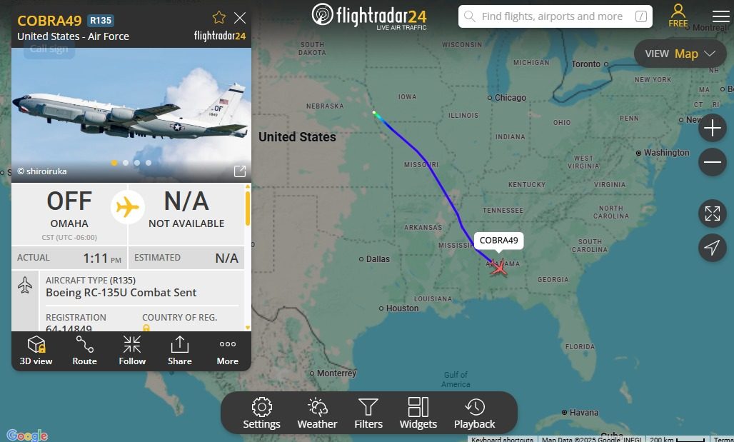 La Fuerza Aérea de Estados Unidos desplegó este lunes 24 de noviembre un avión de reconocimiento estratégico RC-135U Combat Sent, identificado con el indicativo de llamada COBRA49, el cual despegó desde la base aérea de Offutt, en Nebraska, con rumbo sureste hacia el área de influencia del Caribe, según monitoreo de tráfico aéreo proporcionado por FlightRadar24.