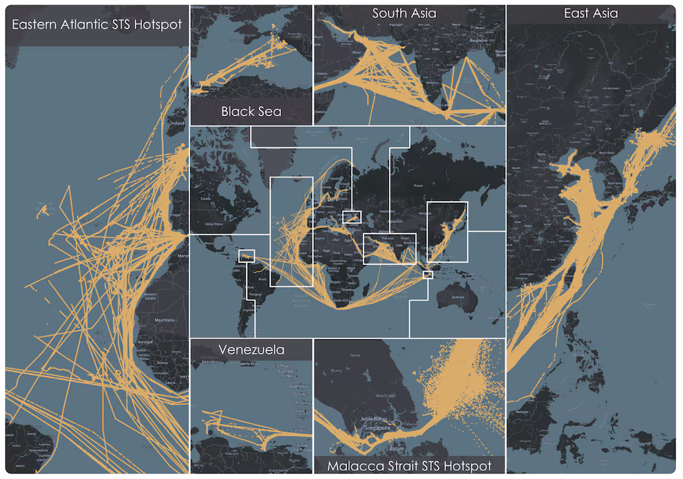 Los patrones de navegación son consistentes y maximizan la opacidad. Los cargamentos se originan en puertos de Venezuela, Rusia o Irán; con frecuencia son transbordados a otros buques de la misma red en aguas muy transitadas al este del estrecho de Malaca —dentro de la zona económica exclusiva de Malasia, donde el control es más laxo que en aguas territoriales— y desde allí completan su tramo final hacia puertos de la República Popular China. En esos encuentros, que pueden tomar hasta tres días en VLCC, los capitanes recurren a “viajes en negro” (apagado del AIS) o, más sofisticado aún, al “apretón de manos AIS”: una nave apaga su transpondedor mientras otra emite su identidad para simular continuidad y evitar levantar alertas.
