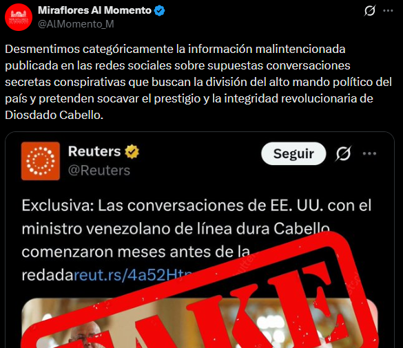 A través de la cuenta @AlMomento_M en la red social X, identificada como el nuevo canal de difusión del oficialismo, se rechazó la información divulgada. «Desmentimos categóricamente la información malintencionada publicada en las redes sociales sobre supuestas conversaciones secretas conspirativas que buscan la división del alto mando político del país y pretenden socavar el prestigio y la integridad revolucionaria de Diosdado Cabello», rezó el comunicado.