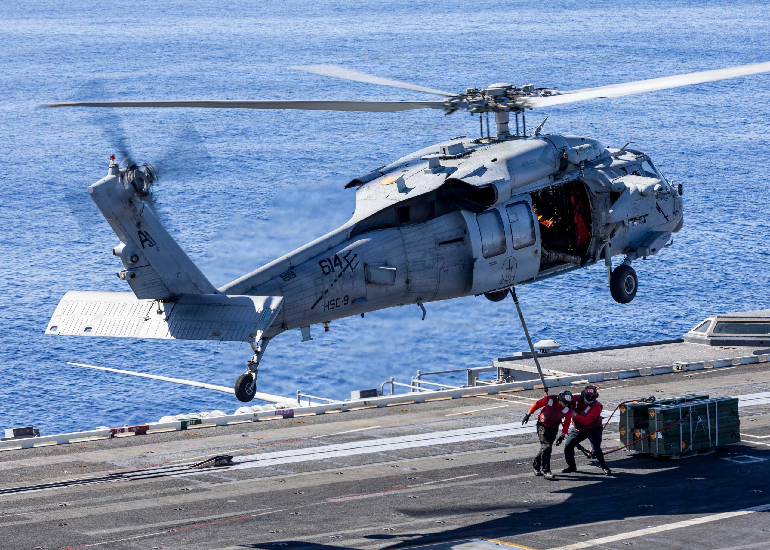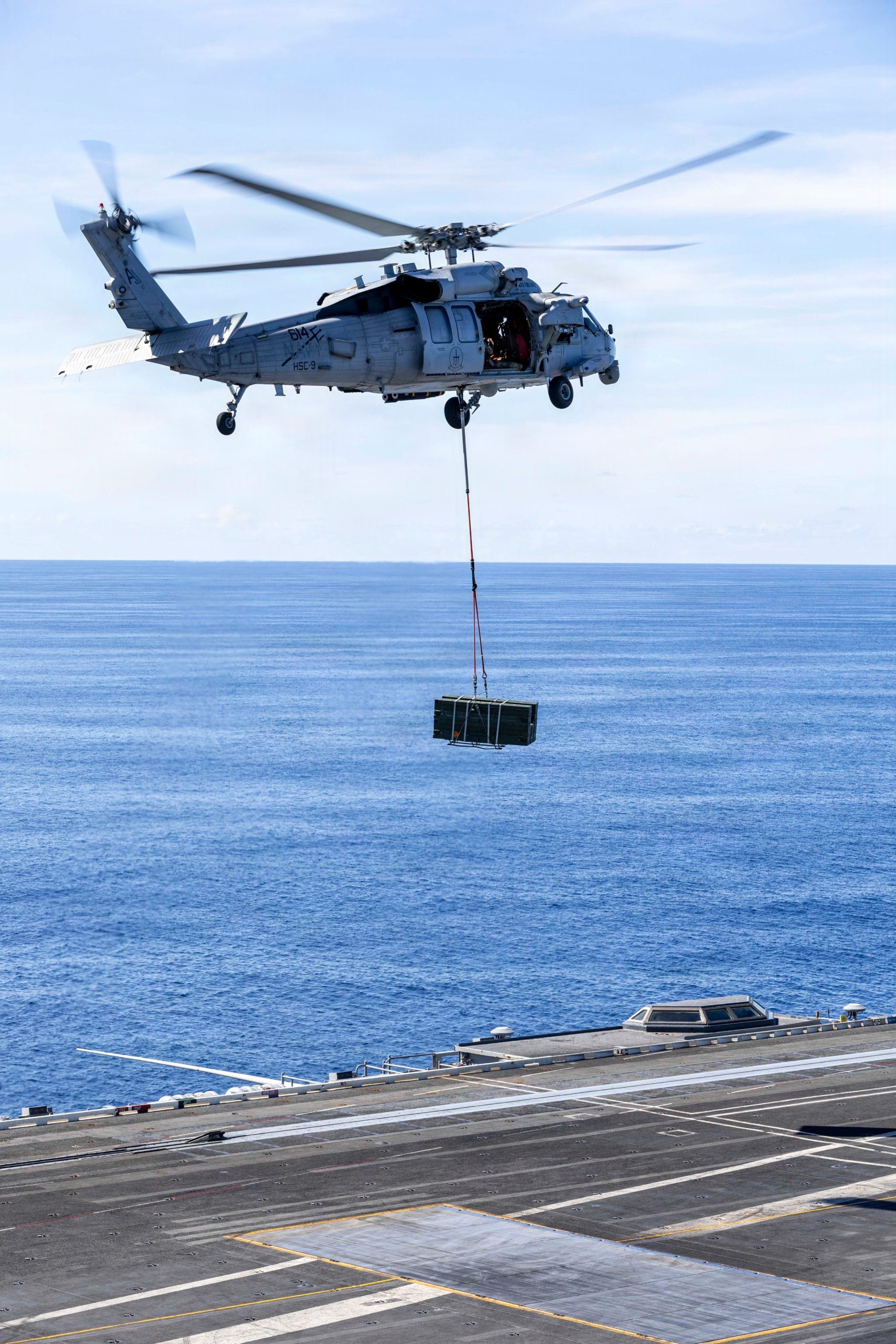 La operación de logística vertical mostró a un helicóptero MH-60S Sea Hawk realizando la transferencia de cajas que contenían misiles AGM-114 Hellfire. Estos misiles aire-tierra son un componente clave del arsenal de la agrupación naval.