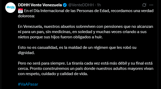 “En Venezuela, nuestros abuelos sobreviven con pensiones que no alcanzan ni para un pan, sin medicinas, en soledad y muchas veces criando a sus nietos porque sus hijos fueron obligados a huir. Esto no es casualidad, es la maldad de un régimen que les robó su dignidad”, expresó la organización opositora.