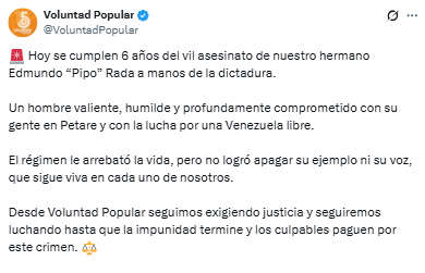 En su mensaje, Voluntad Popular enfatizó que, si bien el crimen buscó silenciar su voz, no logró borrar el impacto de su trabajo comunitario y político.