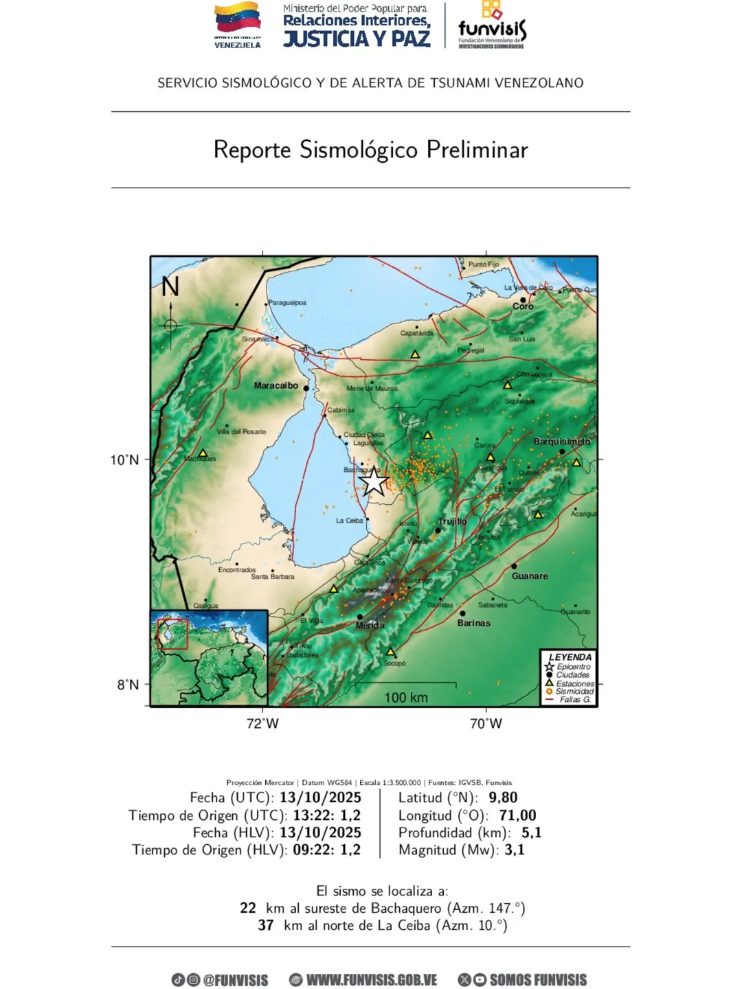 La Fundación Venezolana de Investigaciones Sismológicas de Venezuela (Funvisis) publicó este lunes a través de sus redes sociales que se registró un sismo de 3,1 al sureste de Bachaquero, en el estado Zulia.