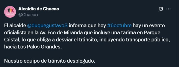 El alcalde del municipio Chacao de Caracas, Gustavo Duque, anunció que este lunes habrá desvío temporal del tránsito vehicular hacia Los Palos Grandes, debido a la instalación de una tarima a la altura de Parque Cristal para un acto chavista.