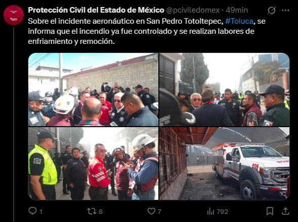 Protección Civil indicó que, tras el impacto de la aeronave, se registró un incendio, el cual ya fue controlado por los cuerpos de emergencia. Actualmente, las autoridades realizan labores de enfriamiento y remoción en la zona del siniestro.