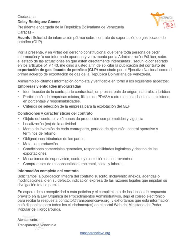 «Solicitamos la publicación íntegra del contrato suscrito, incluyendo anexos, adendas o modificaciones o, en su defecto, indicación expresa de las razones legales que impidan su divulgación total o parcial», reza el documento, donde la organización indica su correo electrónico de contacto «para recibir la respuesta».