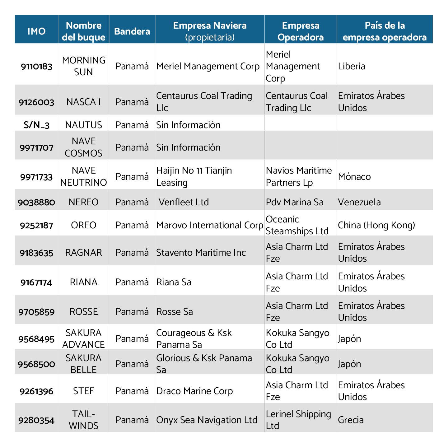 Las otras tres embarcaciones de las 16 operadas desde los Emiratos Árabes Unidos están a cargo de navieras diferentes, pero igualmente comprometidas porque dos buques están sancionados (Apus de Julius Capital y Avril de Kroeger Tankers) y uno es furtivo (Nasca I de Centaurus Coal Trading).