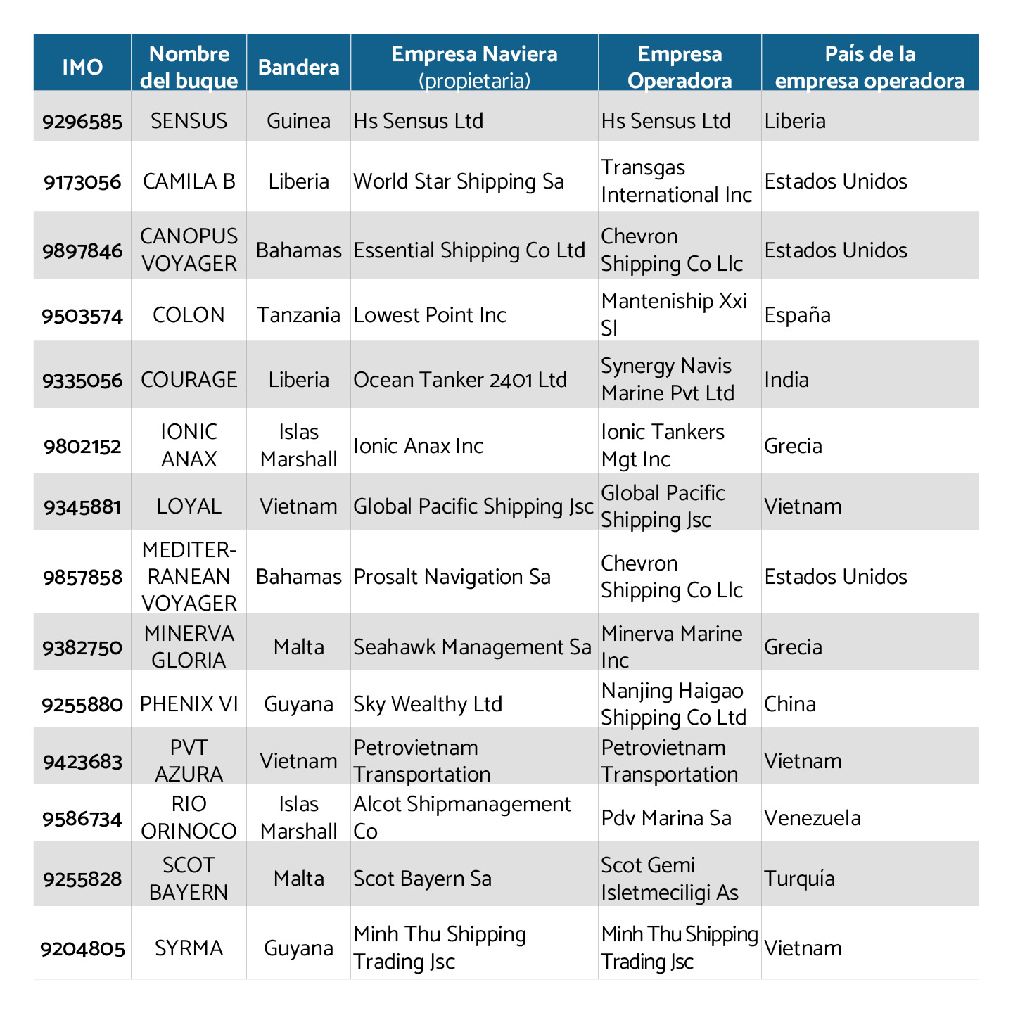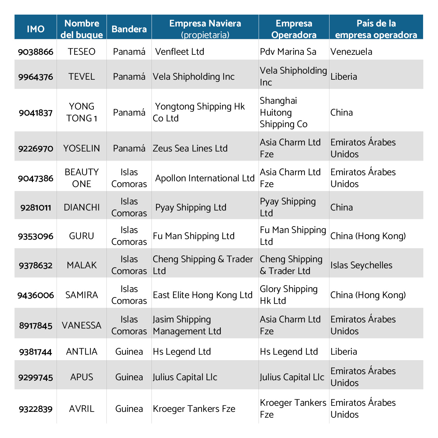 El análisis de los datos globales de los tres meses (julio, agosto y septiembre) permitió comprobar que 10 buques con banderas extranjeras están exclusivamente al servicio de PDV Marina -navegan entre los 8 puertos petroleros de Venezuela-, en su mayoría registrados en Panamá y las Islas Comoras por compañías navieras de Emiratos Árabes Unidos.