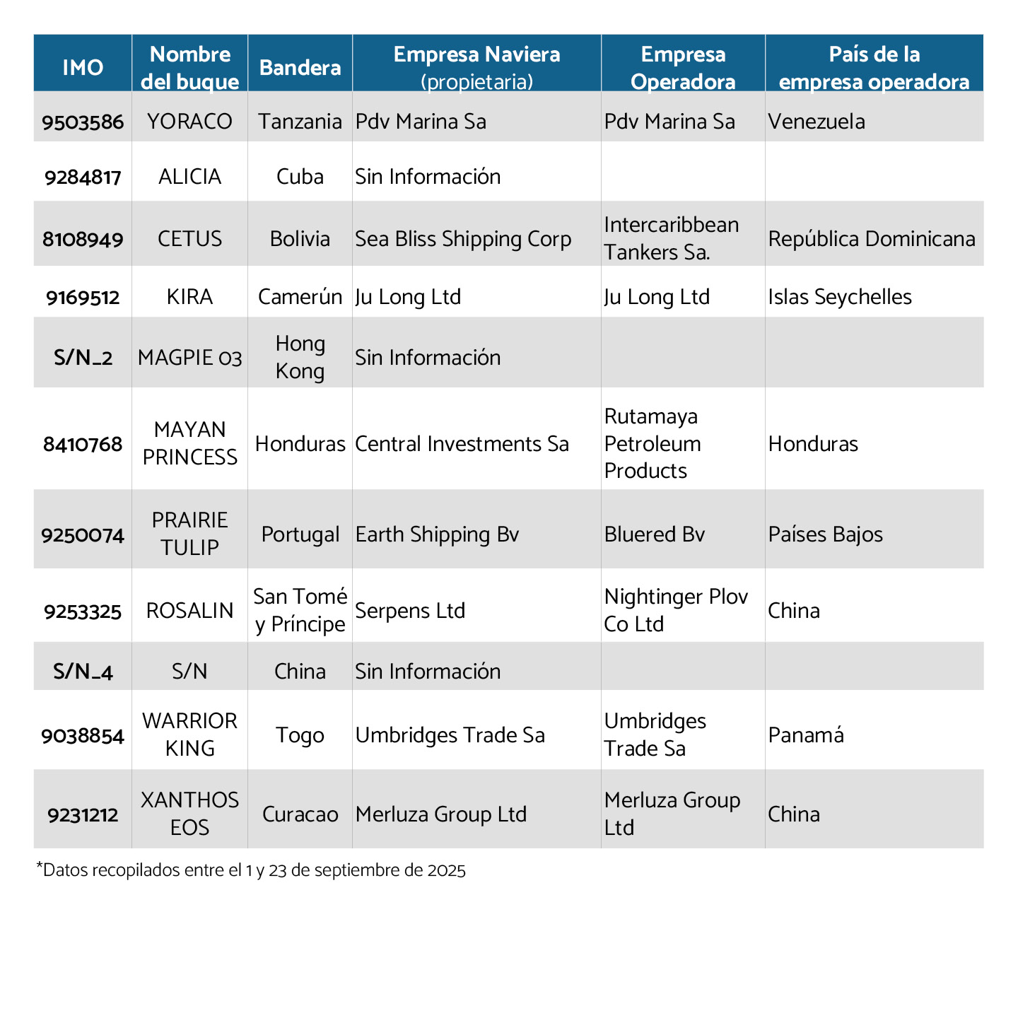 En comparación con los dos meses anteriores, 52 embarcaciones vistas en septiembre ya habían sido detectadas en las costas venezolanas, y 11 tanqueros de petróleo, gas, derivados y químicos son nuevos en este lapso, por lo que, hubo 63 navíos con banderas extranjeras identificados, que no incluyen los 29 sin señal o en modo oscuro. Del total de 110 tanqueros en aguas territoriales venezolanas en septiembre, 18 buques tienen bandera de Venezuela.