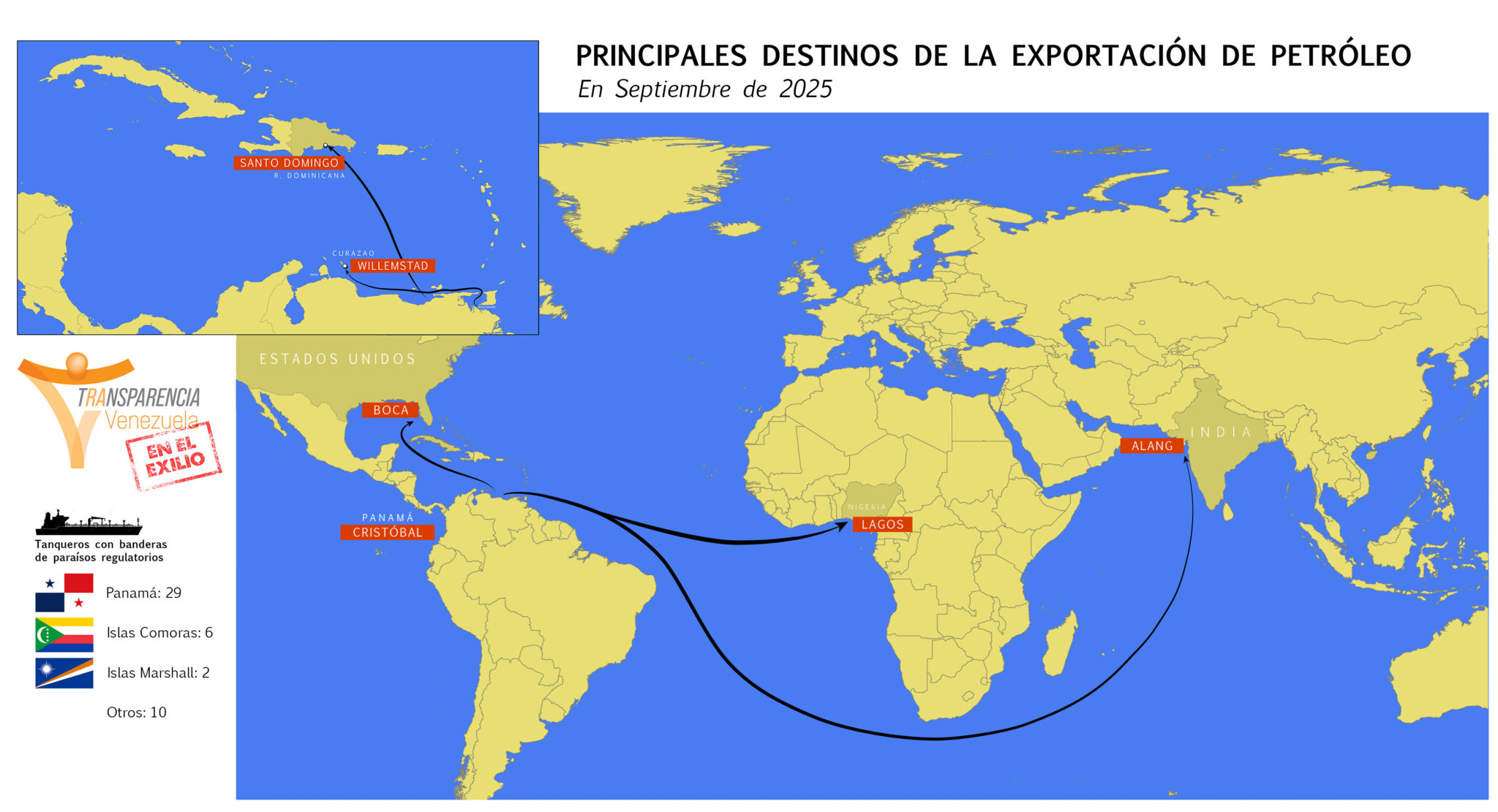 Del total de 110 tanqueros detectados en el monitoreo de Transparencia Venezuela en aguas territoriales venezolanas en septiembre, al menos 47 están en situación irregular y 12 son buques sancionados por la Oficina de Control de Activos Extranjeros (OFAC, por sus siglas en inglés) del Departamento del Tesoro de Estados Unidos, la OFSI (Office of Financial Sanctions Implementation) del Reino Unido y por la Unión Europea, cuyas navieras operadoras tienen sede en China, Vietnam, Liberia, Emiratos Árabes Unidos (EAU) o las Islas Seychelles.