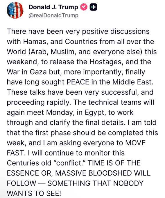 El presidente de Estados Unidos, Donald Trump, publicó un mensaje en su red social Truth Social destacando avances significativos en las conversaciones para poner fin a la guerra en Gaza y lograr la paz en Oriente Medio.