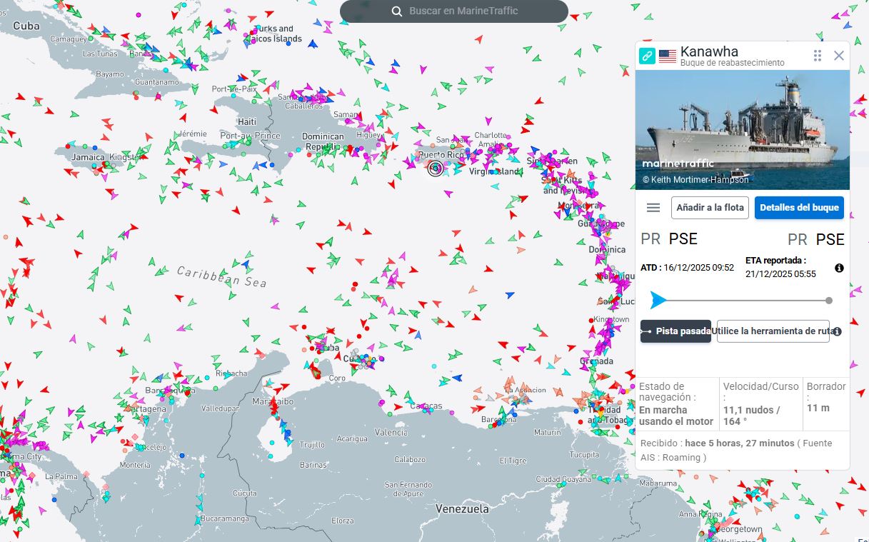 El buque de reabastecimiento naval estadounidense USNS Kanawha (T-AO-196) fue detectado en la plataforma MarineTraffic la tarde del martes 16 de diciembre, saliendo del muelle de Ponce en Puerto Rico, con rumbo hacia el mar Caribe central.