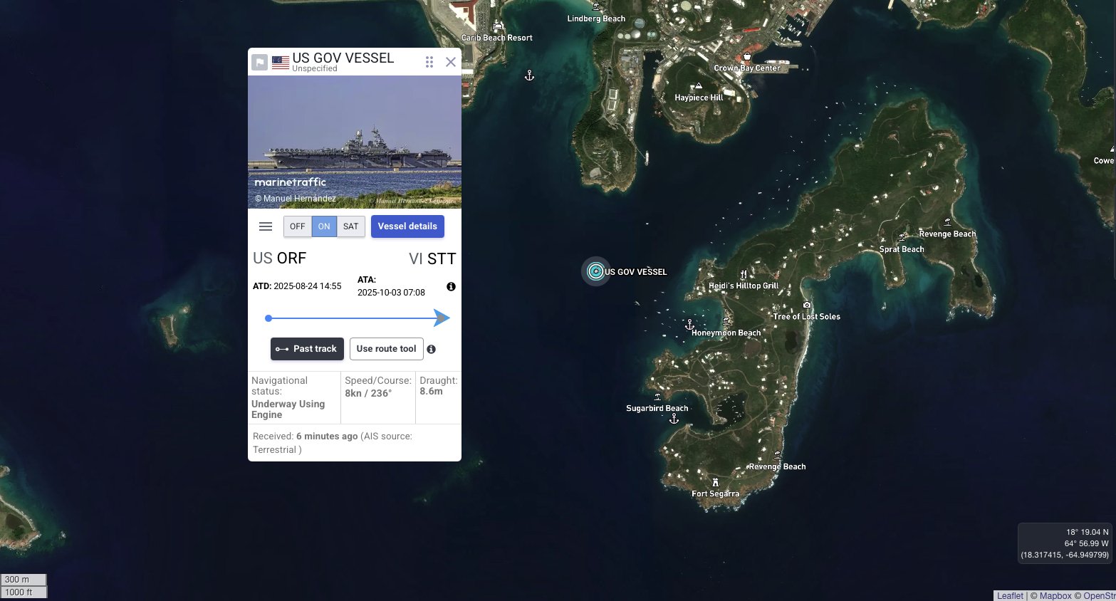 La información, visualizada en rastreadores de tráfico marítimo, indica que el buque partió recientemente del terminal marino Austin «Babe» Monsanto en la isla de St. Thomas, con rumbo a aguas abiertas del Caribe para continuar con sus misiones.