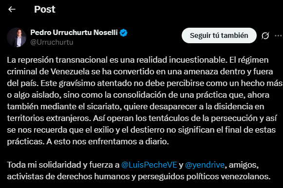 En un mensaje difundido en sus redes sociales, Urruchurtu señaló que “la represión transnacional es una realidad incuestionable” y alertó que el ataque contra Peche y Velásquez no es un hecho aislado, sino parte de una estrategia sistemática de persecución de la disidencia venezolana, ahora extendida mediante el sicariato en territorios extranjeros.
