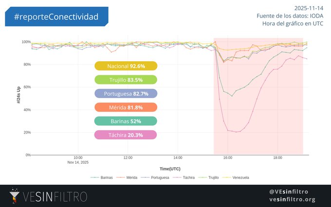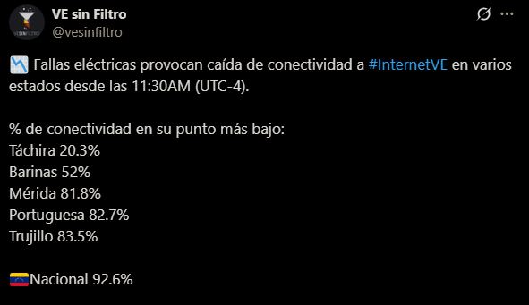 Según un reporte publicado en su cuenta de X, la región occidental fue la más afectada, con Trujillo registrando su nivel más bajo de conectividad en 83,5 %, seguido por Portuguesa (82,7 %) y Mérida (81,8 %).