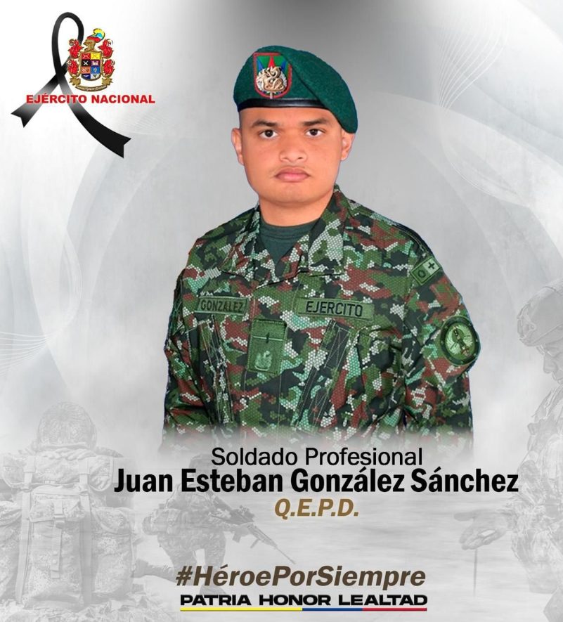 «Este acto terrorista se registró a la altura de la vereda (aldea) Palmeras, en el municipio de Tibú, (en el departamento de) Norte de Santander, y dejó como resultado la muerte de nuestro soldado profesional Juan Esteban González Sánchez”, agregó la información.