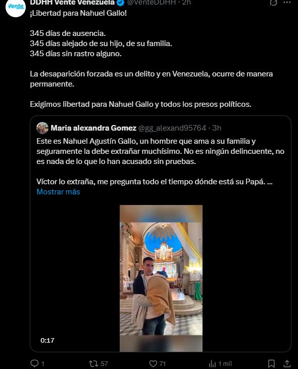 La declaración de Vente Venezuela respondió a un post publicado horas antes por Maria Alexandra Gómez, pareja de Nahuel Gallo, quien difundió un video en el que se relata el dolor que atraviesa la familia.