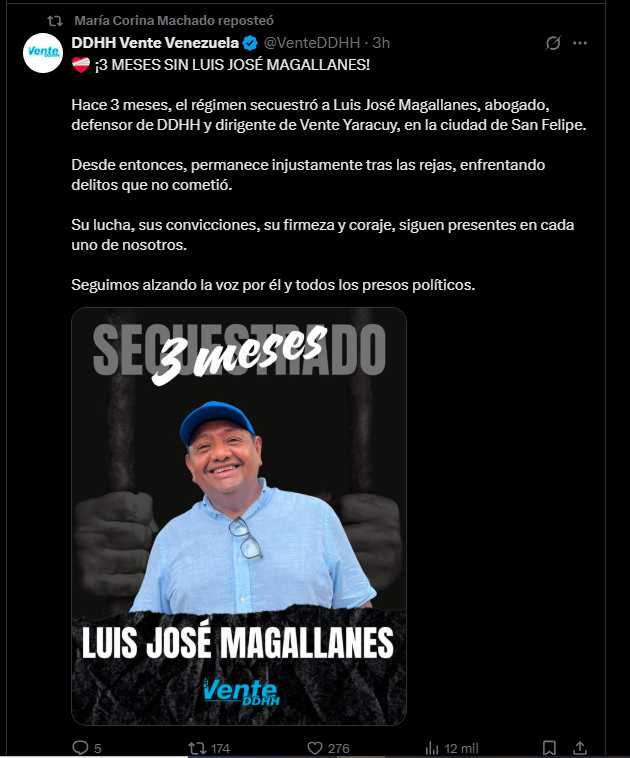 A través de su cuenta oficial en X (antes Twitter), el Comité recordó que en el mes de julio 2025, el régimen chavista secuestró a Luis José Magallanes, abogado, defensor de DDHH y dirigente de Vente Yaracuy, en la ciudad de San Felipe.