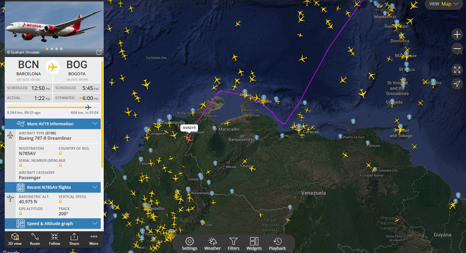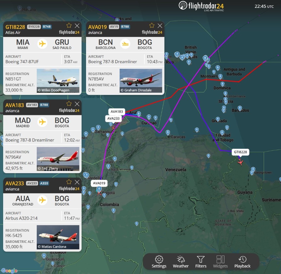 Entre las aeronaves que modificaron su ruta se encuentran: GTI8228 (Atlas Air) – Miami-São Paulo. AVA019 (Avianca) Barcelona-Bogotá. AVA183 (Avianca) Madrid-Bogotá. AVA233 (Avianca) Oranjestad-Bogotá. Todos estos vuelos muestran trayectorias desviadas hacia el este y norte del FIR, evitando sobrevolar territorio venezolano.